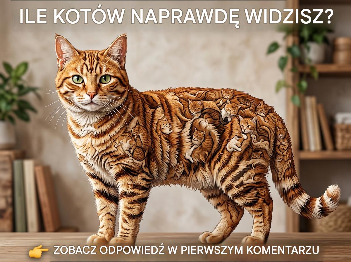 Na pierwszy rzut oka widzisz dużego, rudego kota siedzącego spokojnie i patrzącego prosto przed siebie. Ale jeśli przyjrzysz się bliżej, zaczyna się dziać coś dziwnego. Nagle odkrywasz, że na zdjęciu ukrytych jest więcej kotów.