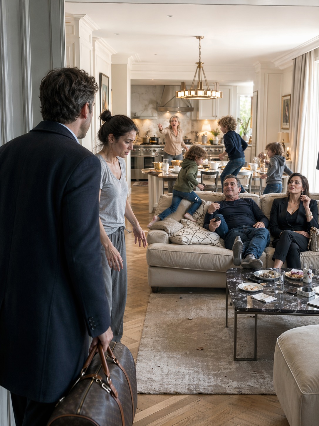 Troje dzieci biegało po salonie, krzycząc, skacząc między fotelami, jakby były właścicielami tego miejsca.