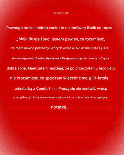 Moja droga żono, zrozumiesz, że mam potrzeby, których nie jesteś już w stanie zaspokoić w wieku 57 lat. Bardzo się cieszę z Twojego szczęścia i uważam Cię za dobrą żonę.